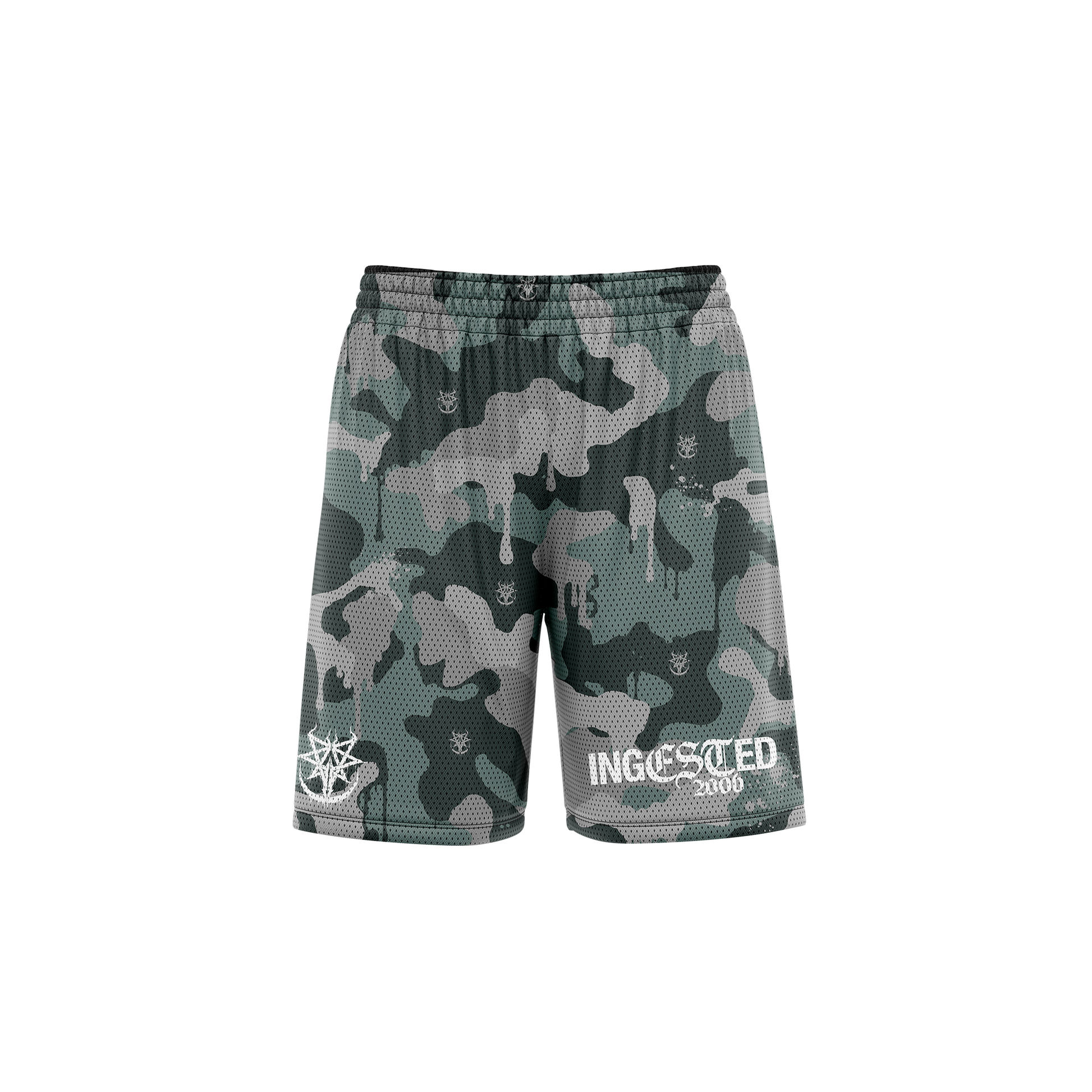 Our new production capabilities allow us to make some truly special merch, and this is a perfect example of what we can do. A custom hand-drawn blood splatter camo pattern, with hidden Ingested sigils was printed onto fabric and sewn into premium mesh shorts.